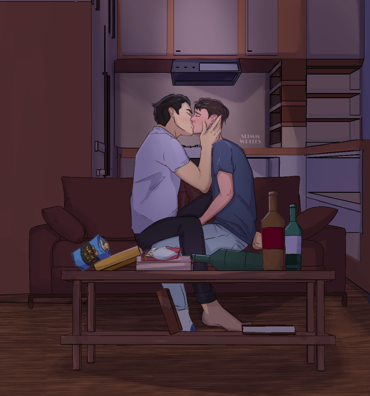 >The truth or dare kiss from book one drawn by @SlimmWrites.